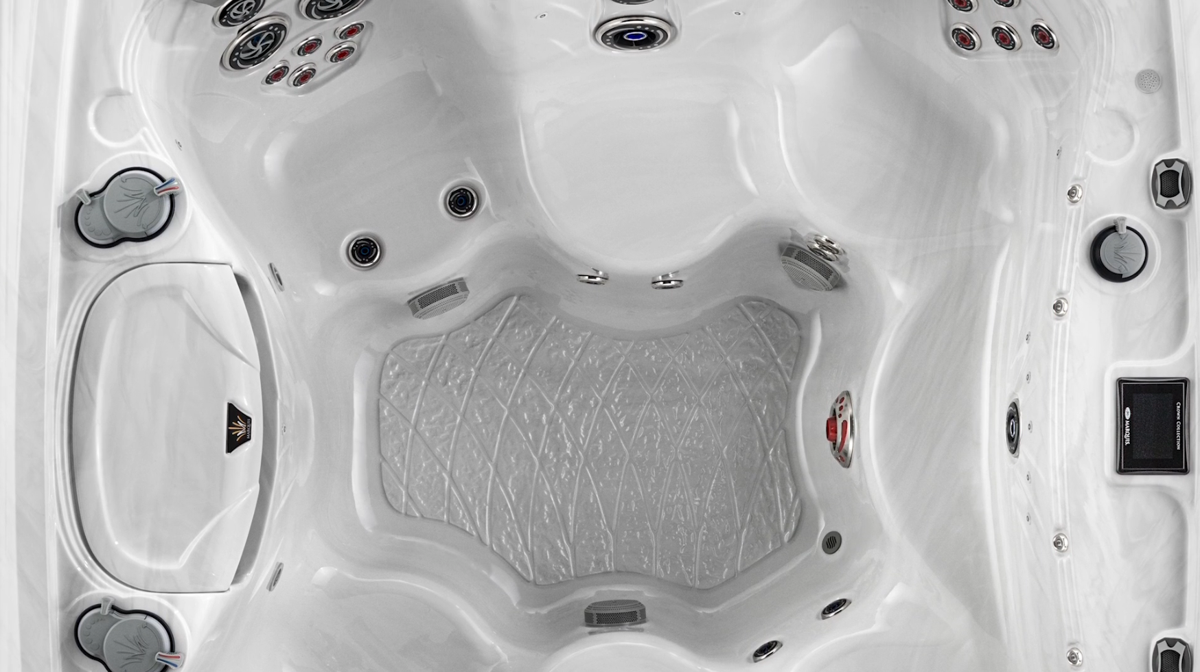 Crown Series Destiny offers a spacious and comfortable setting with seven hydromassage seats. Two deep seats provide targeted Lumbar and Shoulder H.O.T. Zone relief, while a mid-height therapy seat features a broad cluster of jets to soothe the back. Equipped with a Regal Whitewater-4 jet, the spa offers a total of four H.O.T. Zones. Its varied seating heights ensure everyone can find their ideal comfort level